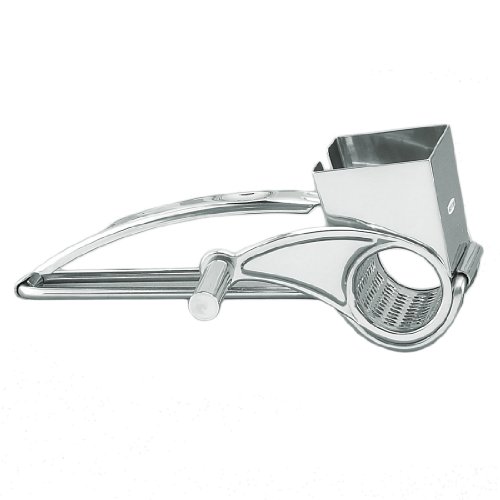 Have fresh grated cheese quickly and easily with this rotary style cheese grater. This rotary style grater is easy to use; simply add cheese to hopper and turn handle. It's also safe to use because your fingers are kept far away from sharp blades. Made of durable and long lasting stainless steel. Dishwasher safe.